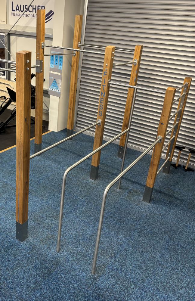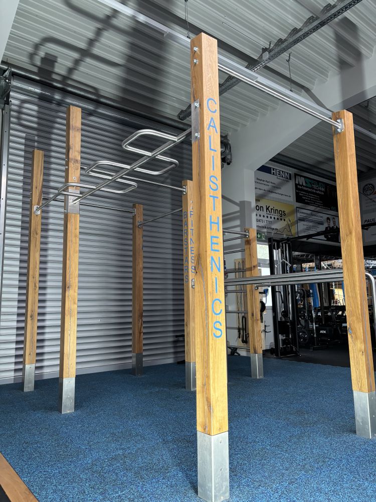 In unserem Calisthenics Bereich erwartet euch unsere hauseigene, hochwertige Calisthenics Anlage. Die optimale Kombination aus massiven Eiche Balken und Stangen aus Edelstahl, bieten euch eine perfekte Trainingsgelegenheit, mit unendlichen Möglichkeiten an Übungen. Kleine, edle Akzente und der Schriftzug aus blauem Epoxidharz, verleihen unserer Anlage ihre Exklusivität und steigern den Aufforderungscharakter.